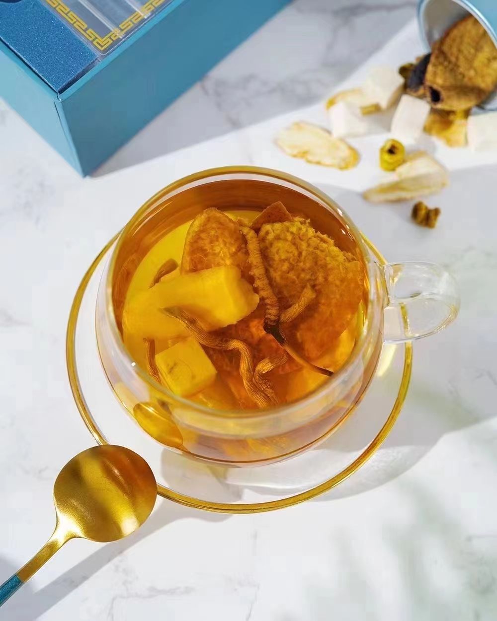 「配方」 冬蟲夏草10克,乳鴿1只,花膠30克,(花膠又名魚肚,是從魚腹中取出魚鰾,切開曬干后而成。)生姜1片。