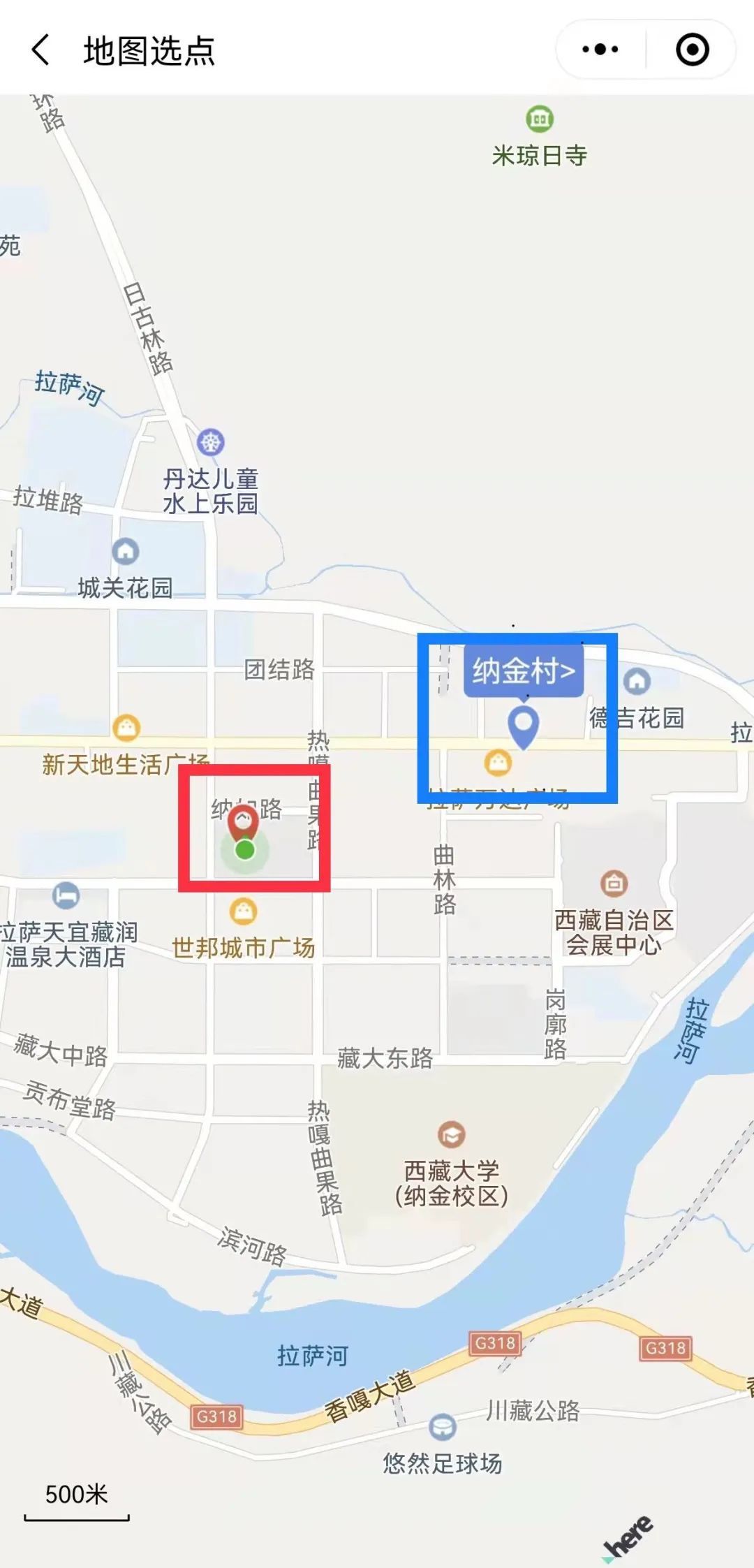 第三步:紅色位置,為搜索地點自行輸入地址定位點;藍色位置,為你所定位地點的管控街道(鄉(xiāng))和社區(qū)(村),請點擊。