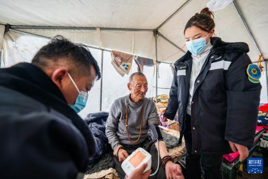 在那曲市索縣西昌鄉(xiāng),衛(wèi)生院醫(yī)務(wù)人員為蟲草採集點的牧民測量血壓(5月18日攝)。新華社記者 丁增尼達 攝